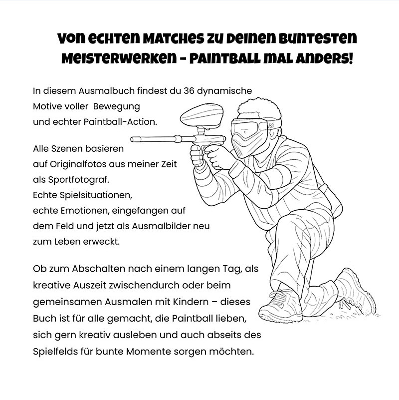 Egal ob du selbst Paintball spielst, gerne zeichnest oder einfach mal den Kopf frei bekommen willst – dieses Buch verbindet Action mit Achtsamkeit. Jedes Motiv steckt voller Bewegung, Dynamik und Atmosphäre und lädt dazu ein, selbst Farbe ins Spiel zu bringen.